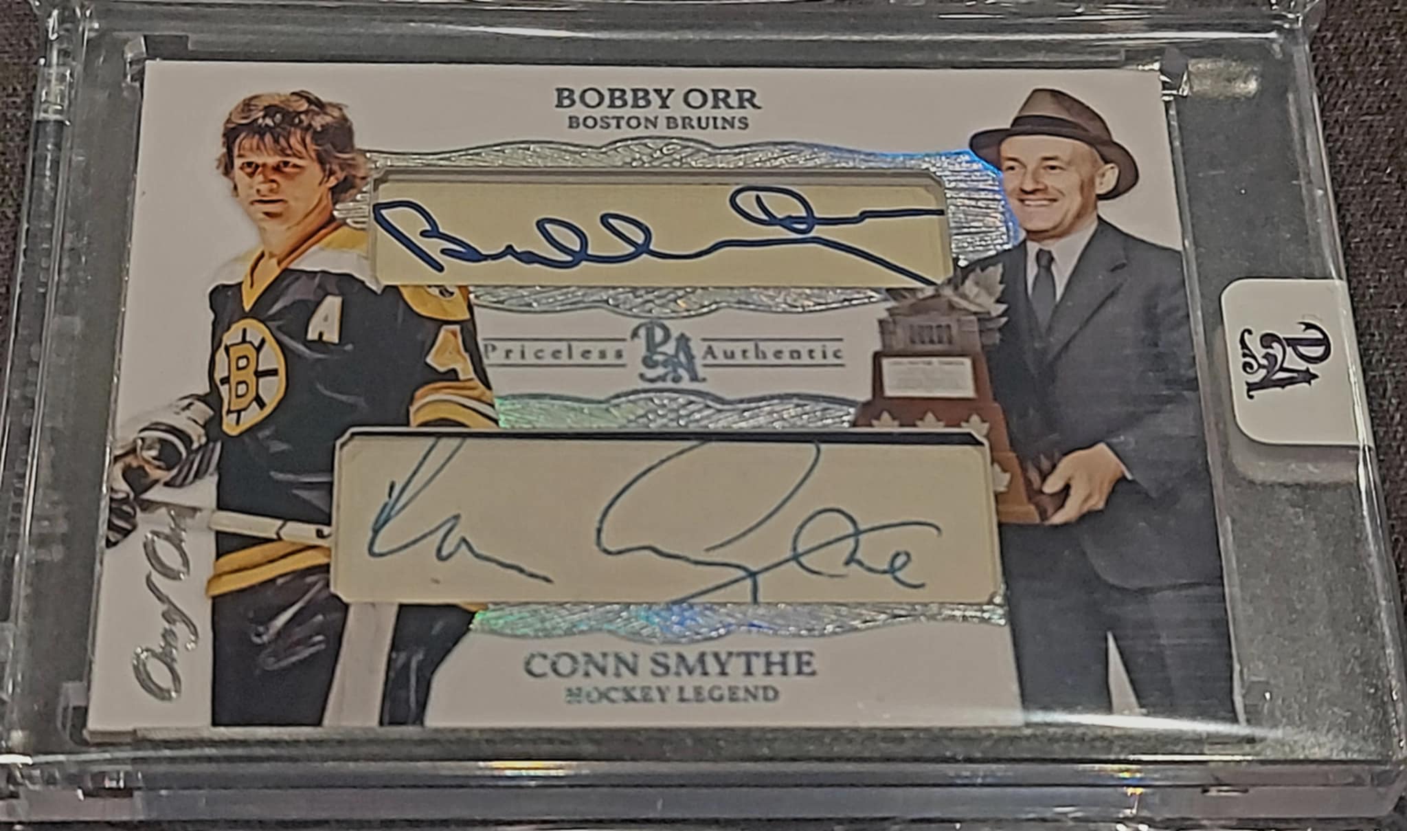 Yours to own is this stunning 1/1 BOBBY ORR & CONN SMYTHE Boston Bruins DUAL AUTO Card from PRICELESS AUTHENTIC!Shipping to the United States is 24.95!Shipping within Canada is 19.95!This auction is subject to applicable taxes within Canada.Buyer responsible for all duties and/or tariffs if shipping to the United States.