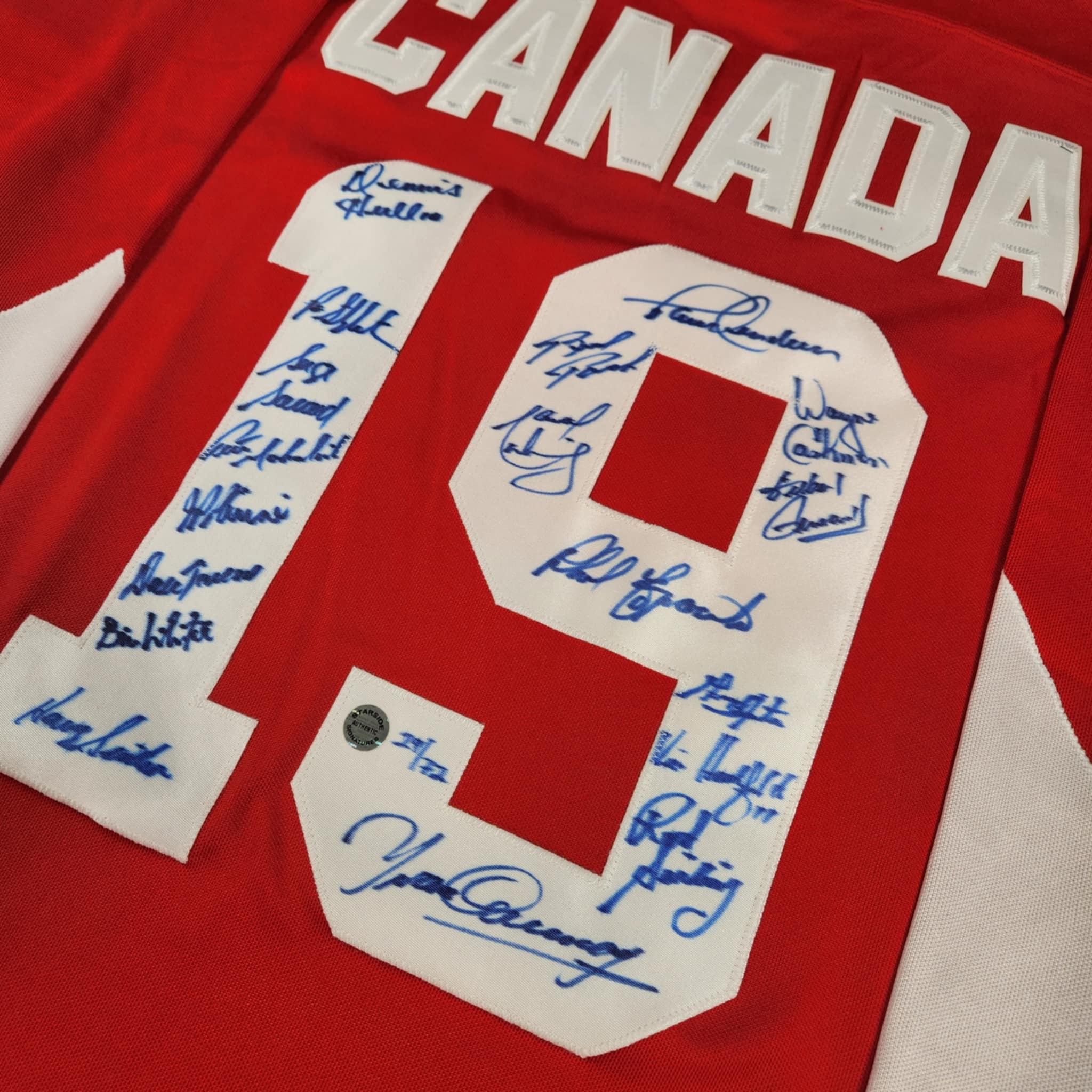 This hockey jersey is signed by members of the team including Paul Henderson, Phil Esposito, Brad Park, Yvan Cournoyer, Guy Lapointe, Serge Savard, Gilbert Perreault, Marcel Dionne, Dennis Hull, Dale Tallon, Pat Stapleton, Wayne Cashman, Bill White, Pete Mahovlich, J.P. Parise, Rod Seiling, Vic Hadfield and coach Harry Sinden.